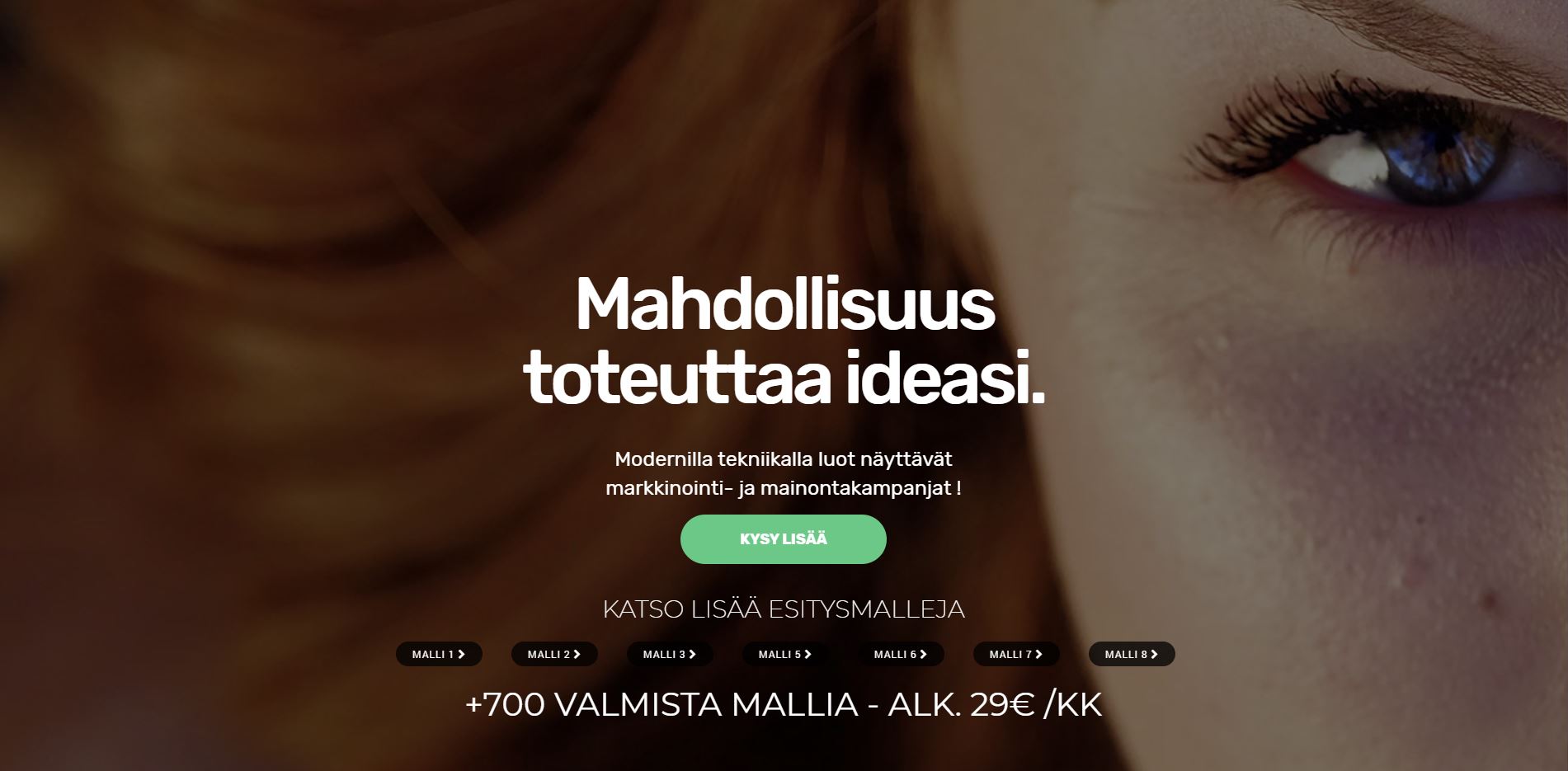 RevolutionCutting edge features, tons of examples, regular security checks.HANKI NYTKATSO LISÄÄ ESITYSMALLEJAMalli 2 Malli 1 Malli 3 Malli 5 Malli 6 Malli 7 +700 VALMISTA MALLIA - ALK. 29€ /KKMalli 8
